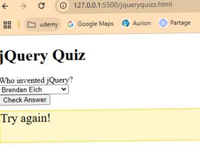 Quelques lignes de mon code..."$("#quiz-form").on("submit",)"; ""eventpreventDefault";"var $answer = $("#trivia-answer"); var answer = $answer.val(); if (answer ==="resig"){ $("#result").text("You did it!") } else{ $("#result").text("Try again!") }". Pour développer ce quizz j'ai d'abord créé un formulaire puis... j'ai utilisé un "event listener" de DOM. Le code montre que l"event listener" va générer un évenement à chaque fois que l'utilisateur cliquera sur le bouton "answer". Dans ce jeu l'évenement généré dépendra du choix séléctionné par l'utilisateur. Ce code permet à l'utilisateur de rester sur la page car javascript intercepte les données recueillies sans l'utilisation d'un serveur exterieur. Le variable $answer store la collection des réponses que l'utilisateur peut choisir. Plus précisément le fonctionnement de la méthode Jquery "val" est structuré sur le choix sélectionné par l'utilisateur: J'ai ajouté dans mon code des conditions afin que l'utilisateur puisse savoir si sa réponse est correcte: